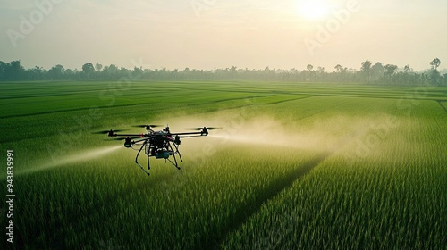 Agricultural drone spraying pesticide over a green rice paddy, with mist trails visible in the sunlight