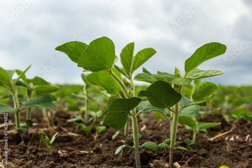 Agricultural soy plantation on sunny day - Green growing soybeans plant against sunlight