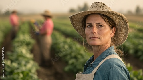 Agricultural Worker in a Field, Dedicated Female Farmer in Straw Hat Overlooking Vegetable Crop Rows with Colleagues Working in Background During Warm Summer Day