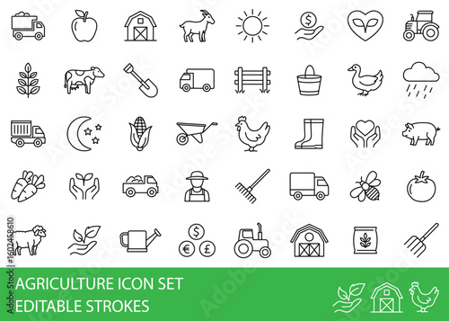 agriculture, icon, set, outline, isolated, simple, collection, vector, tractor, lorry, transport, logistic, tool, shovel, weather, sun, logotype, money, coin, fresh, produce, apple, farm animal, poultry, chicken, goat, cow, pig, rake, leaf, sheep, barn, corn, rain, fence, business, bee, line art, minimal, design, equipment, food, nature