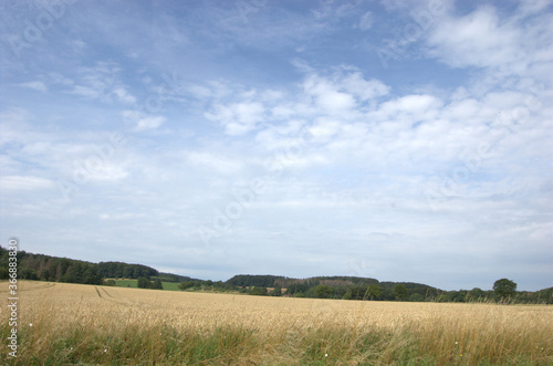 sky, field, landscape, grass, nature, meadow, summer, green, cloud, blue, cloud, rural, agriculture, farm, horizon, land, countryside, hill, scene, outdoors, country, view, tree, sun, german, europa, tour tourism, travel