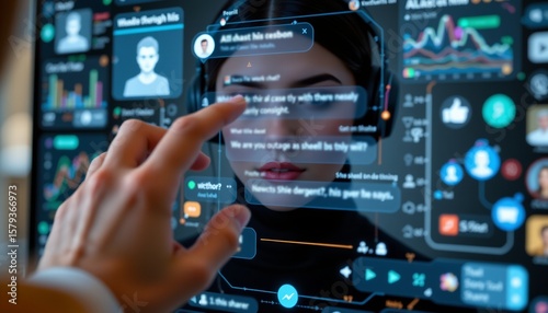 ai chat bot conversation interface, virtual assistant answering user, person touching virtual screen, intense spotlight on subject at the top with clear copy space at the bottom.