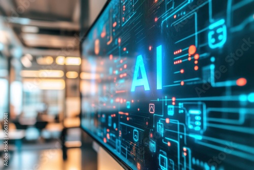 ai, artificial, intelligence, technology, display, screen, modern, office, setting, futuristic, digital, network, datum, circuit, board, blue, glowing, light, line, dot, abstract, concept, innovation, future, progress, advancement, development, automation, machine, learning, computing, algorithm, system, software, hardware, interface, user, life events