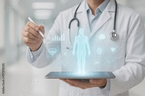doctor, tablet, hologram, medicals, health care, interface, technology, diagnosis, visualisation, clinic, datum, analysis, stylus, precision, science, innovation, information, touch screen, smart, future, digital, modern, professional, equipment, monitor, design, human, diagram, graph, abstract, network, system, clean, sharpened, trust, blue, connection, tool, virtual, intelligence, display, gesture, environment, graphic, ai