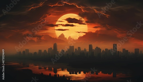 AI generated illustration of a vibrant urban city skyline illuminated by the warm colors
