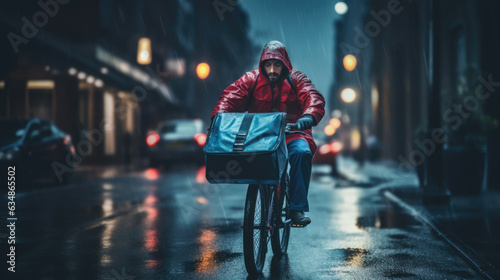 Ai generative image of food delivery man riding a bicycle on a city street with a large backpack in the rain