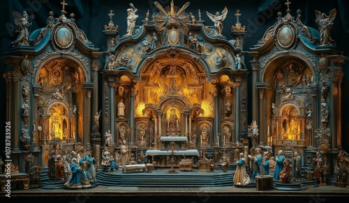 AI generator image of Christian Church,Medieval Christian Church Interior,City europe,European interior in imperial style on dark gold background, in dark black ebony style, miniature, transportcore
