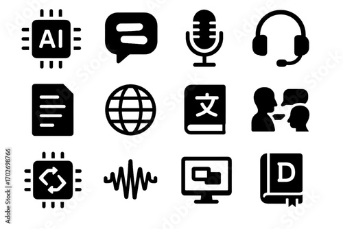vector, icon, text, processor, conversation, translation, voice, microphone, document, ai, globe, language, headset, speech, screen, display, dictionary, interface, wave, chips, book, bubble, solid, symbol, black, glyphs, collection, set, silhouette, pictogram