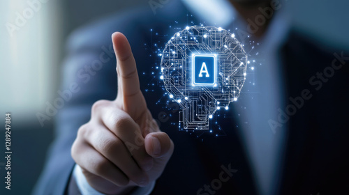 ai, artificial intelligence, technology, innovation, futuristic, abstract, circuit board, network, connectivity, datum, information, idea, light bulb, glowing, blue, dark background, hand, finger, touching, interaction, man, businessman, professional, modern, creative, elegant, corporate, business, future, progress, development, solution, thinking, strategy, algorithm, software