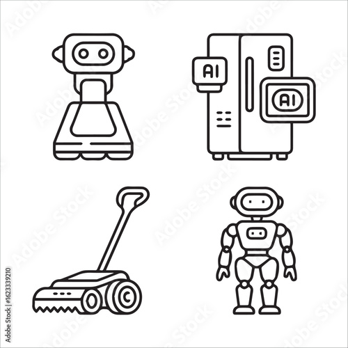 ai, robot, artificial, intelligence, smart, home, automation, machine, technology, futuristic, appliance, device, robotic, lawn mower, cleaner, treadmill, fitness, modern, innovation, future, digital, electronic, contraption, intelligent, control, system, equipment, appliance, robotic, cleaning, exercise, icon, vector, set, icon, symbol, web, illustration, signs, design, business, buttons, computer, music, medicals, cyberspace