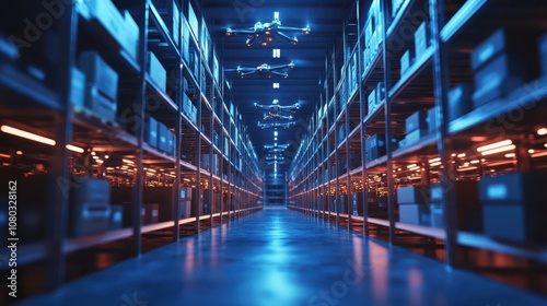 warehouse, drone, supply, modern, illuminated, blue, light, showcase, row, shelve, box, freight, control, sky, shipping, transport, workflow, shipment, flight, process, system, report, network, feature, datum, resource, service, safety, seller, cargo