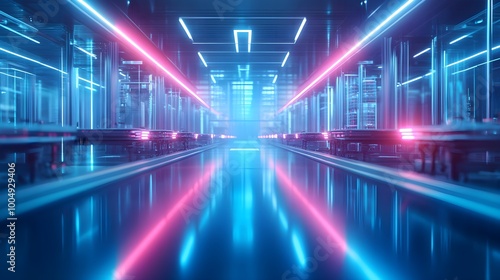 AI-controlled machines performing real-time food quality checks in a sterile, high-tech facility, vibrant neon blue holograms, Cyberpunk, Digital painting