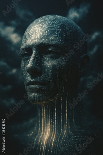 Ai-enhanced digital face emerging from clouds in abstract technology art
