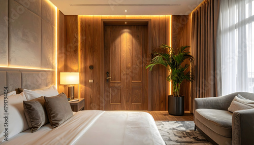 AI-generated image of A modern and elegantly styled bedroom featuring a teakwood door framed by vertical wooden panels and accentuated with warm ambient lighting.