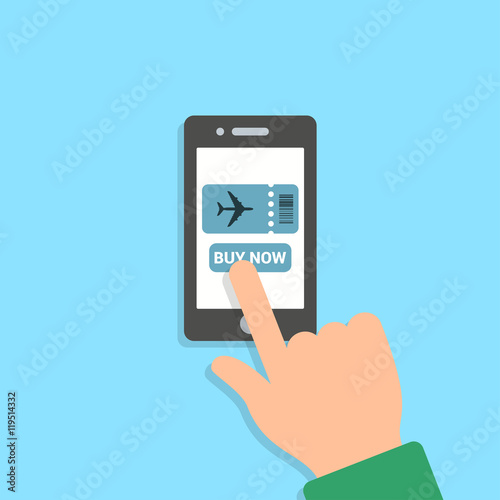 Air ticket vector concept illustration. Person buys a plane ticket. The hand presses on the phone