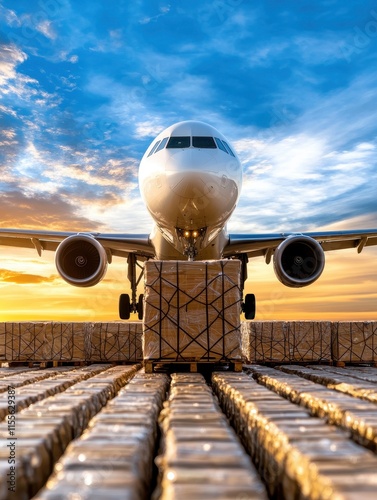 aircraft, cargo, pallet, runway, sunset, sky, aeroplane, freight, transportation, logistic, import, export, travel, aviation, supply, industry, shipping, globe, movement, landscape, horizon, cloud, sun, scene, delivery