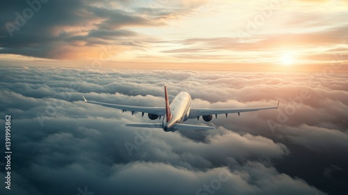 Airplane flying above clouds at sunset. Possible use Travel advertising, stock photography