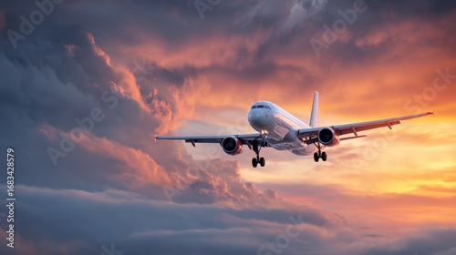 Airplane flying in dramatic sunset sky with clouds