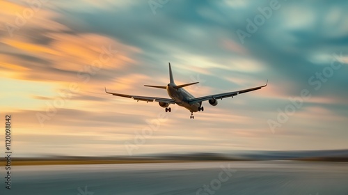 aeroplane, landing, sunset, motion blur, sky, travel, flight, aircraft, aviation, transportation, speed, dynamic, dusk, cloud, journey, aerodrome, runway, descent, image, flying, air travel, jet, airliner, evening, motion, blurred, colourful, orange, horizon, adventure, trip, air, passenger, destination, arrival, technology, machine, fast, wing, exploration, navigate, banner, copy space