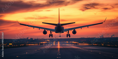 aerodrome, transfer, service, stock, aeroplane, landing, runway, sunset, aviation, travel, transport, flight, cloud, orange, red, dramatic, evening, light, night, silhouette, wing, engine, wheel, approach, terminal, city, landscape, view, powerful, commercial, jet, airliner, adventure, journey, destination, arrival, departure, scene, photo, wide, angle