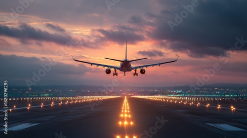 aeroplane, landing, sunset, aerodrome, runway, travel, journey, flight, aircraft, aviation, airline, transportation, dusk, evening, twilight, sky, cloud, light, city, city landscape, night, background, banner, header, website, design, graphic, texture, image, photo, photo, commercial, business, air travel, holiday, vacation, departure, arrival, jet, airliner, aerospace, global, earth, adventure, explore