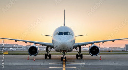 Airplane on runway at sunset, ready for takeoff
