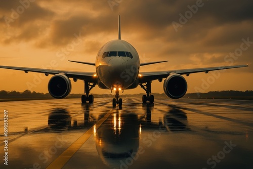 aeroplane, runway, sunset, sky, aviation, travel, transportation, golden hour, cloud, silhouette, wing, engine, landing gear, aerodrome, flight, evening, orange, beautiful, scenic, landscape, horizon, atmospheric, peaceful, serene, calm, destination, journey, vacation, adventure, commercial, jet, take-off, arrival, departure, air travel, skyline, sun, light, shadow, wet, surface, ground, water, air, transport, vehicle, aircraft, global