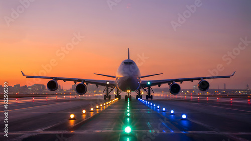 Airplane on runway at sunset with lights guiding the way for safe takeoff