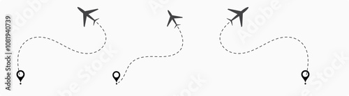 Airplane or aeroplane routes path. Aircraft tracking plane path, travel, map pins, location pins.