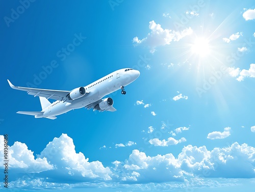 aeroplane, sky, cloud, sun, bright, flight, travel, journey, high, altitude, flying, passenger, jet, commercial, transportation, tour tourism, vacation, destination, horizon, traveler, freedom, adventure, scenic, view, modern, white, engine, wing, plane, powerful, fast, upward, beautiful, clear, weather, summer, blue, cloudscape, sunshine, gliding, vehicle, air, voyage