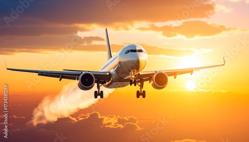 Airplane taking off into golden sunset sky with travel, transportation, and aviation.