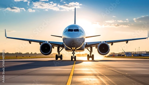 aeroplane, plane, aircraft, jet, airliner, aviation, travel, transportation, sunset, sunrise, runway, aerodrome, airline, flight, journey, sky, cloud, sun, horizon, air travel, departure, arrival, vacation, holiday, tour tourism, transport, aerospace, wing, engine, landing gear, metal, silver, glossy, front view, conceptual, dynamic, digital, education, fitness
