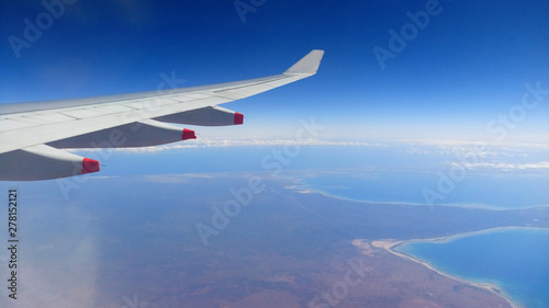 Airplane Window Seat -with beautiful view of wing of plane on flight and traveling in air over city and clouds.