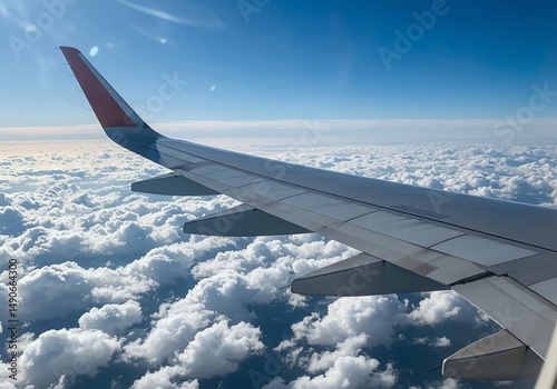 aeroplane, wing, cloud, sky, flying, flight, travel, aviation, cloudscape, view, aerial, high, altitude, white, fluffy, blue, sun, bright, day, scene, landscape, nature, transportation, journey, adventure, perspective, up high, horizon, weather, atmosphere, summer, scenic, photo, image, air, plane