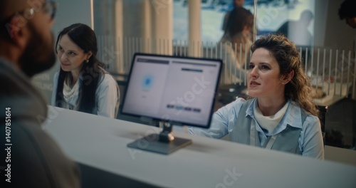 Airport Check-in Counter: Female Airline Worker Checking Tourist Personal ID Data for Flight. Man Putting Finger on Touch Screen for Biometric Fingerprint Scanning. International Airport Terminal.