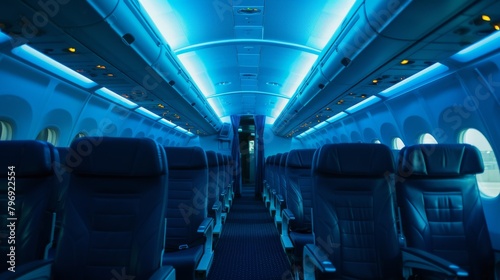 Airport terminal's modern aircraft cabin interior with cozy seats and windows illuminated at night.