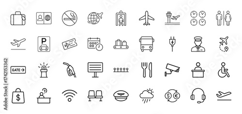 aerodrome, travel, aviation, transport, icon, vector, line, set, pictogram, illustration, journey, flight, global, holiday maker, passenger, baggage, security, passport, aeroplane, pilot, bus, gate, ticket, calendar, time, terminal, departure, arrival, destination, information, comfort station, camera, wi-fi, fuel, food, parking, shopping, exchange, weather, disabled, earphones, control, service, modern, outline