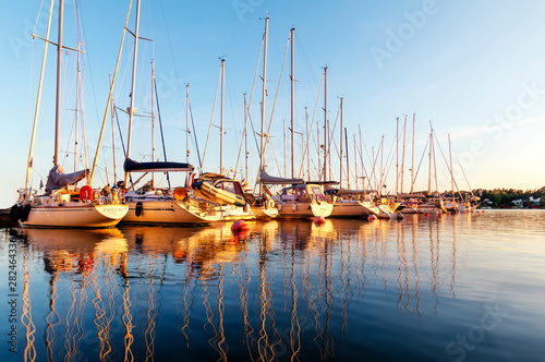 Aland Islands, Finland - View of the embankment with yachts on the Aland Islands. Coast of the Baltic Sea. Beatiful sunset.