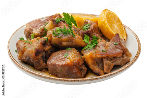 meat, food, cookery, dinner, lunch, hearty, protein, savoury, delicious, plate, cooking, lemon, herb, parsley, garnish, grilled, roasted, comfort food, flavorful, meat dish, culinary arts, gastronomy