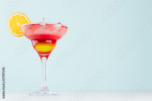 Alcohol juicy fruit red cocktail with red and yellow liquor, orange, ice cubes in wineglass in modern elegant pastel blue interior.
