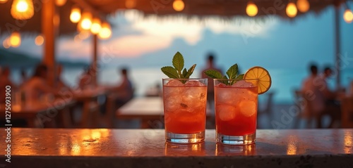 Alcoholic cocktails long drinks on bar counter at defocused beach cafe with unrecognizable people. Summer refreshments concept. Red beverage with mint leaf garnish, citrus slice. Relaxing mood at