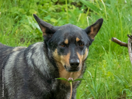 dog, canino, animal, pet, portrait, closeup, head shot, alert, attentive, focused, looking, black, tan, brown, marking, fur, short hair, ear, eye, brown eyes, green, grass, nature, outdoors, daytime, mammal, purebred, loyal, intelligent, watchful, standing, image, picture