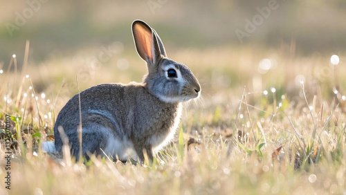 Alert grey-brown Easter bunny nestled in lush grass, displaying a cautious crouching posture. Captivating natural spring holiday scene, ideal for conveying the spirit of Easter and the serene beauty o