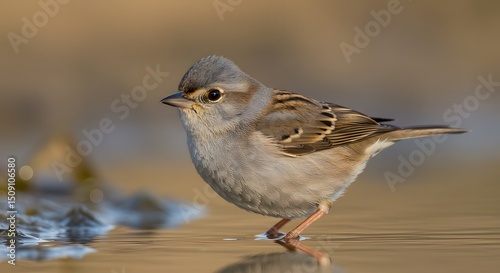 sparrow, bird, avian, songbird, finch, feather, wing, beak, eye, leg, tail, brown, grey, beige, white, standing, alert, watchful, still, curious, drinking, wading, water, puddle, shore, edge, ground, outdoors, wild, natural, morning, light, dawn, gold, sunlit, glow, closeup, portrait, animal, wildlife, nature, bokeh, calm, solitary, tiny