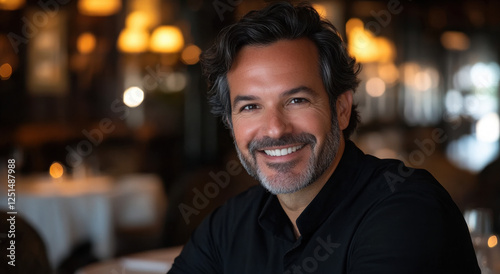 Alex displays a cheerful smile while seated in a warmly lit restaurant, enjoying an evening atmosphere with soft lighting