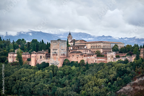 Alhambra Palace in Granada , Spain Full view at sun set time. Sierra Nevada is the backgorund. Albaicin is in front of this monument.