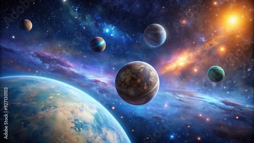 Alien planet with multiple moons in a starry sky, alien, planet, moons, extraterrestrial, space, galaxy, universe, celestial