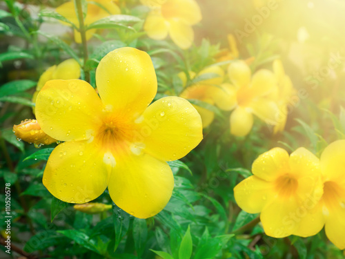 plant, tropical, yellow, beautiful, garden, beauty, green, flower, background, natural, gold, blossom, bloom, trumpet, nature, closeup, fresh, bright, romantic, flora, design, soft, yellow flower, spray, water, rain, moist, wet, light, sunlight, tree