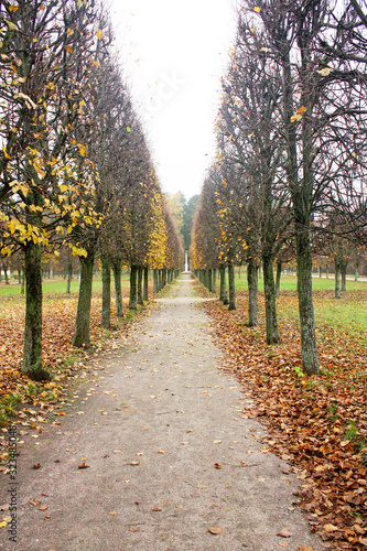 Alley in the Park surrounded by trees in autumn. Colorful nature colors, vertical photo