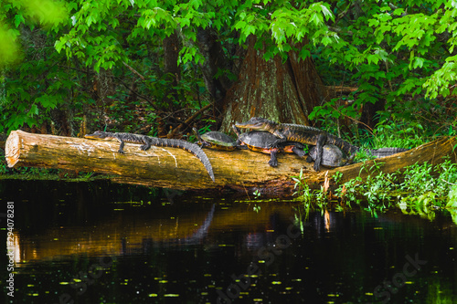 alligator, swamp, turtle, log